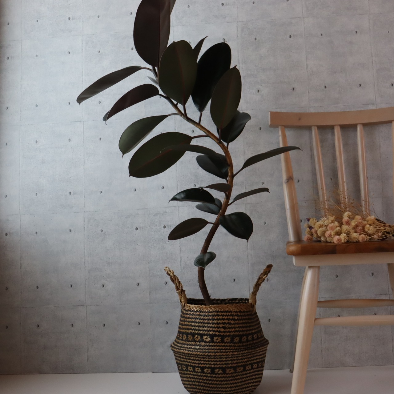 樹形・葉の大きさ・鉢底からのサイズすべてが言うこと無しの フィカス バーガンディ 黒ゴム 曲がり仕立て の入荷です!
